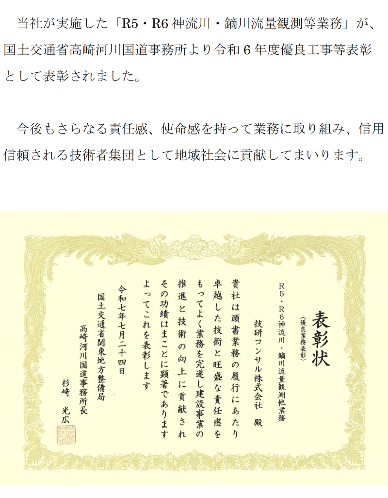 > 国土交通省高崎河川国道事務所優良工事等表彰受賞
